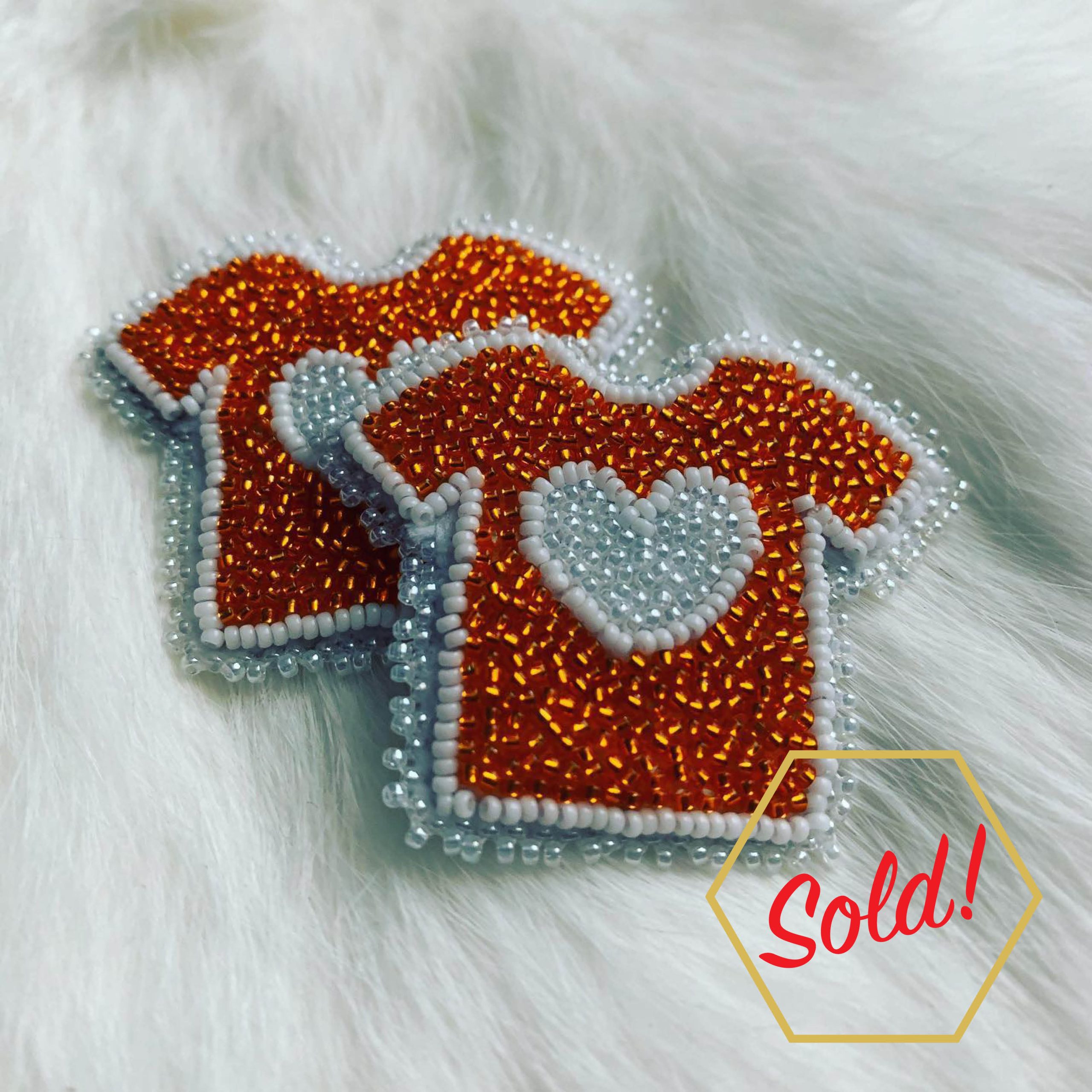 Commission a handmade beaded item. Shown is a beaded orange tshirt pin with white heart, edged in white. Cynthia’s unique beading style features a “one at a time” beading method, resulting in a “popcorn” effect. ($60-500).
